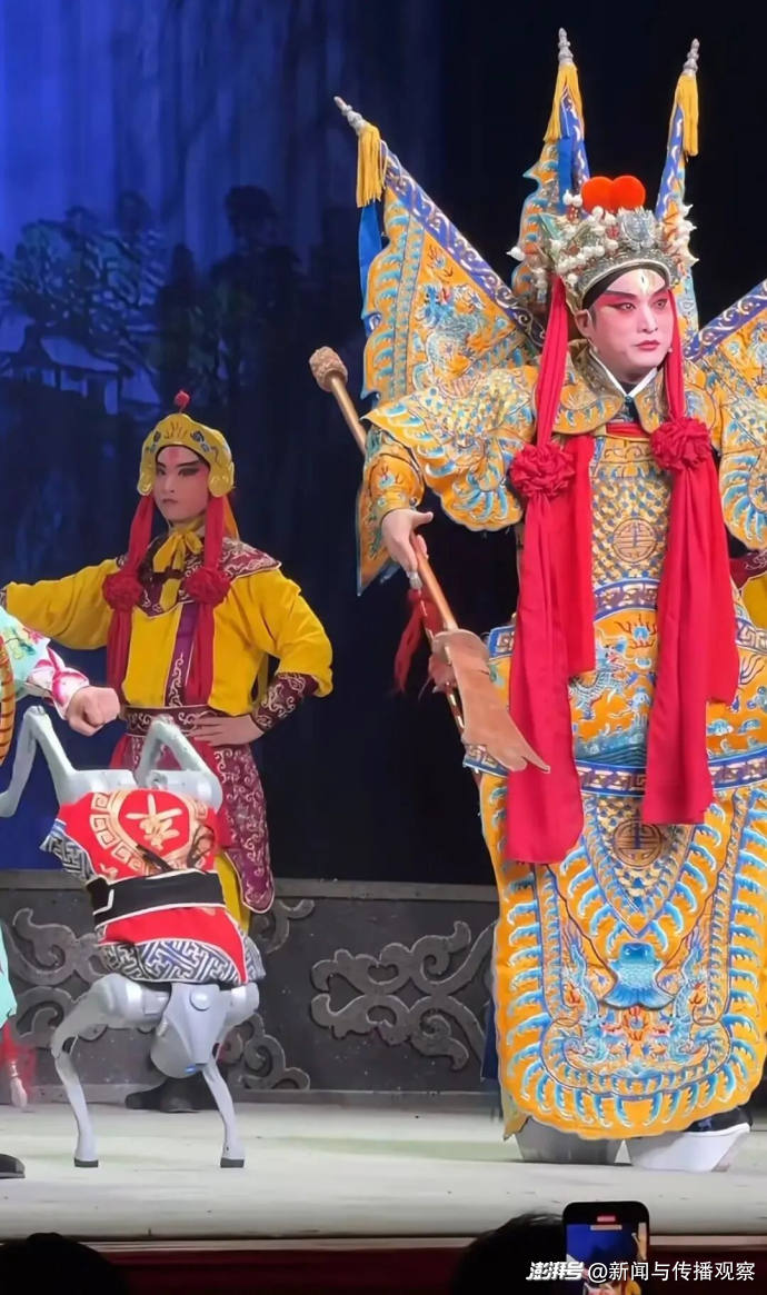 在浙江婺劇團《三打白骨精》中,無人機“扮演”孫悟空變化的“小蜜蜂”,在舞臺空間靈動飛舞,為經(jīng)典情節(jié)平添幾分科幻奇幻色彩;浙江中月婺劇團則在折子戲《虹橋贈珠》中,創(chuàng)新性地讓機器狗穿上戲服扮演哮天犬,其倒立空翻的“絕技”瞬間搶盡風頭。