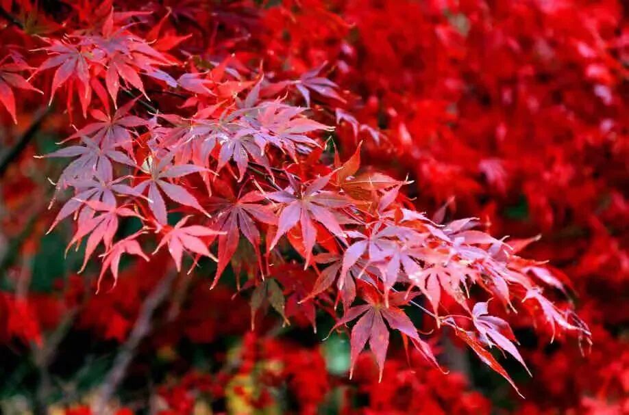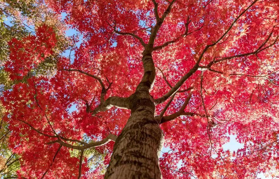 遠觀時,隨風而動的楓樹就像火焰在滾動;近看時,密集的楓葉呈現(xiàn)極具層次感的紅。一陣秋風襲來,樹葉從樹梢飄落,宛若飛舞旋轉的蝴蝶,將秋景渲染到了極致。