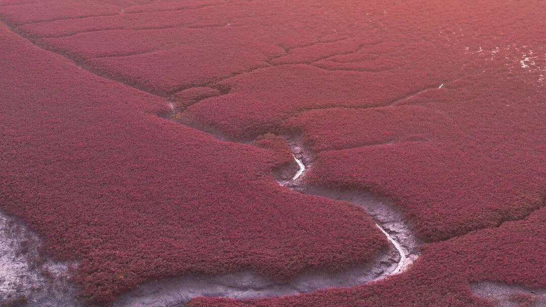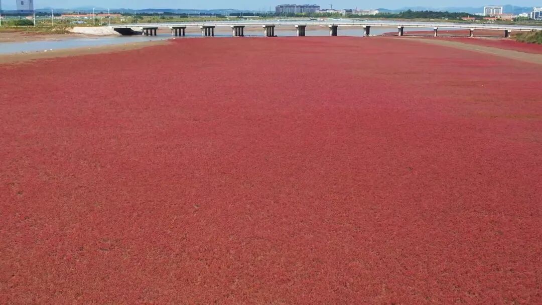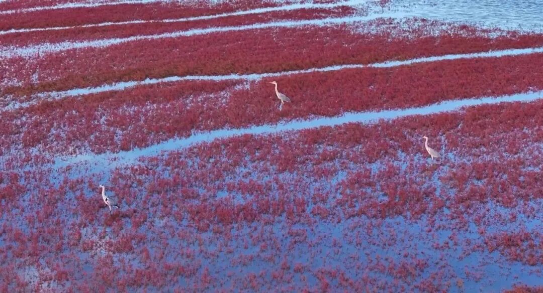 微風拂過連片的翅堿蓬,化作紅色“草浪”輕輕起伏,與澄澈藍天、粼粼海水相映成趣,勾勒出層次鮮明、動靜相宜的濕地圖景,成為威海的秋日限定美景。