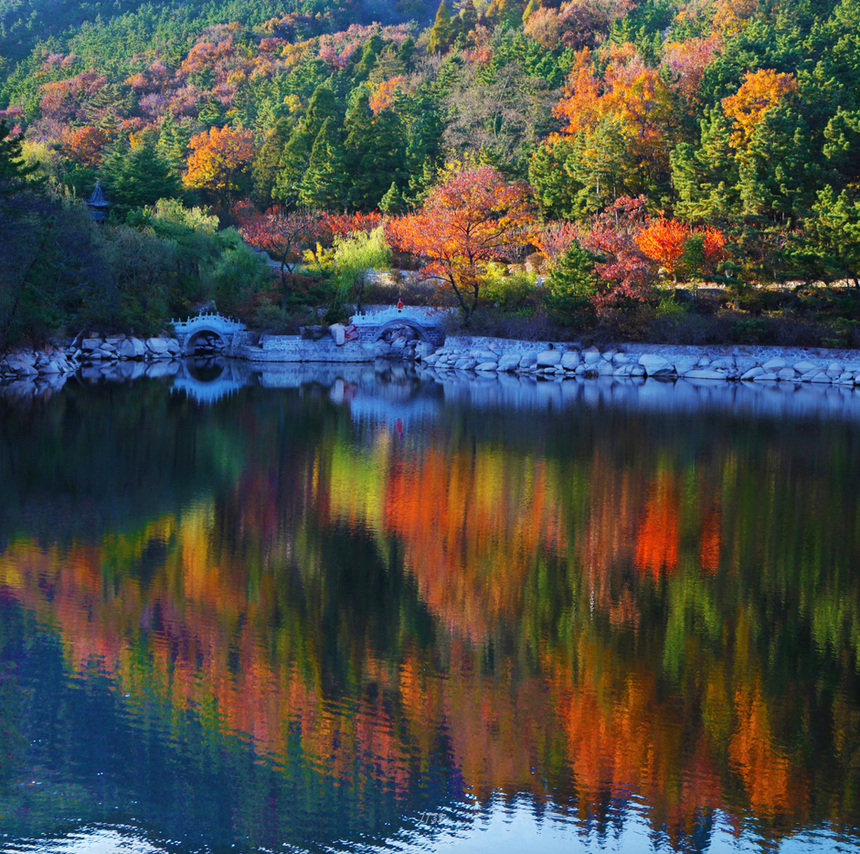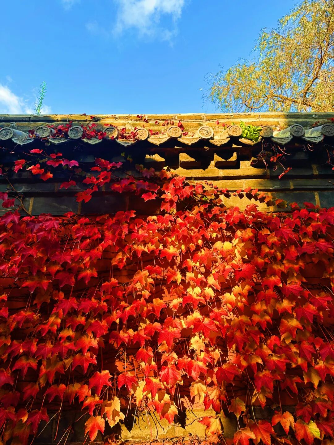 當秋風悄然拂過赤山景區(qū),幾分涼韻開始彌漫在山間,樹葉逐漸變換出多樣的色彩,宛如被大自然的魔杖點染,呈現(xiàn)出別樣的風情。千葉萬樹,沿山底直攀山巔,剎那間,整個山林雀躍起來。紅色的爬山虎,繞上印著龍圖騰的瓦片。大風吹來,楓葉就簌簌落滿一地。