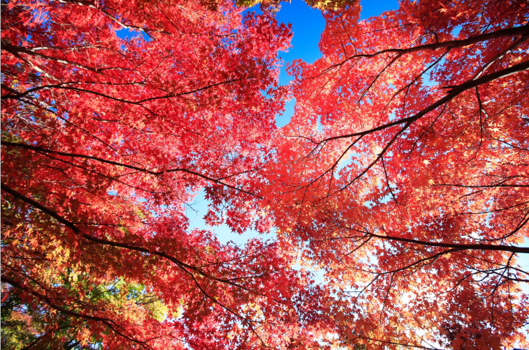 濃郁的綠,熾烈的紅,亮眼的黃……里口山好似濃縮了整個秋色,每一種色彩都讓人無比沉醉。偶有陣風吹過,似是流火落下,仿佛將存了一年的熱情,從山頂傾瀉到你的面前。