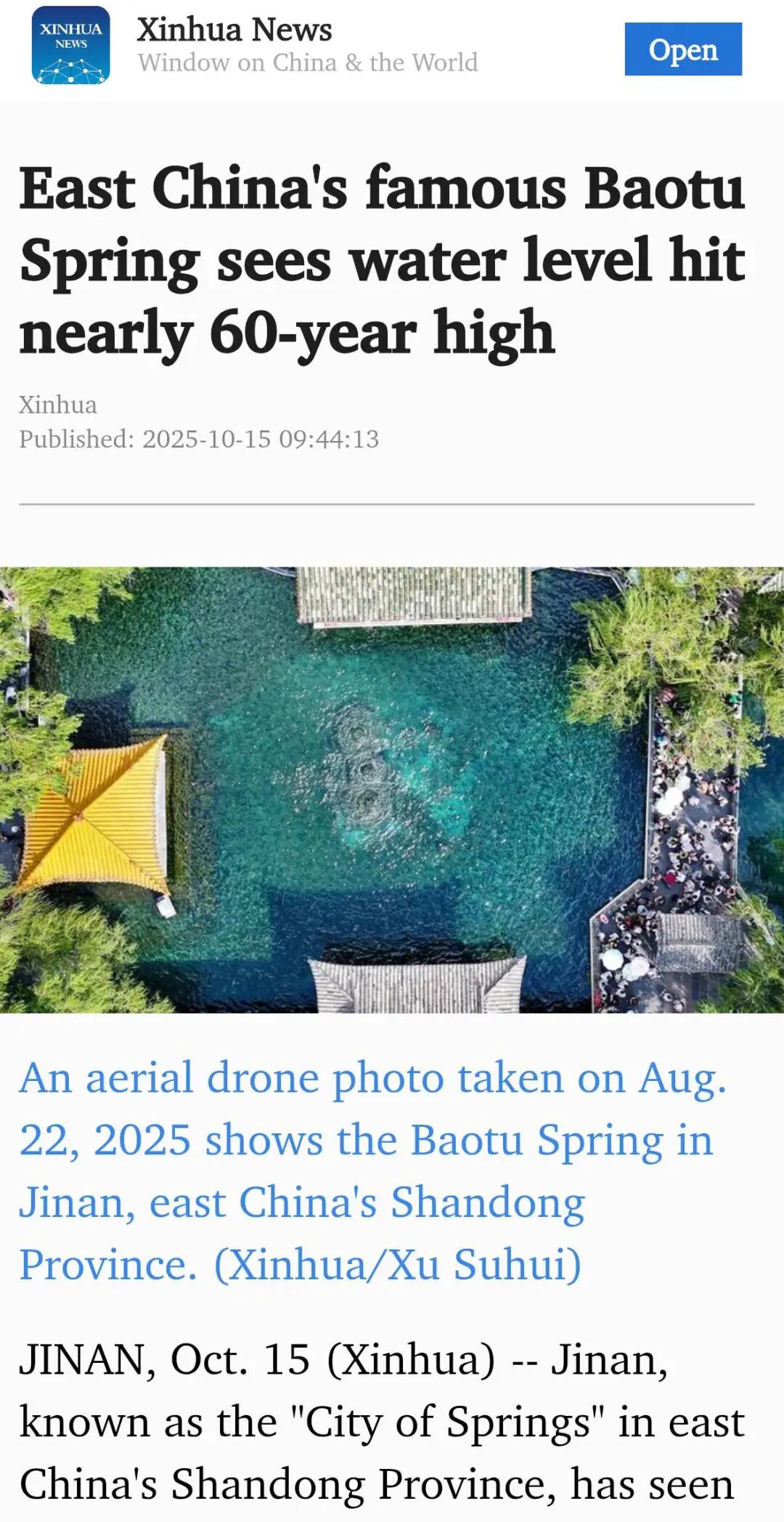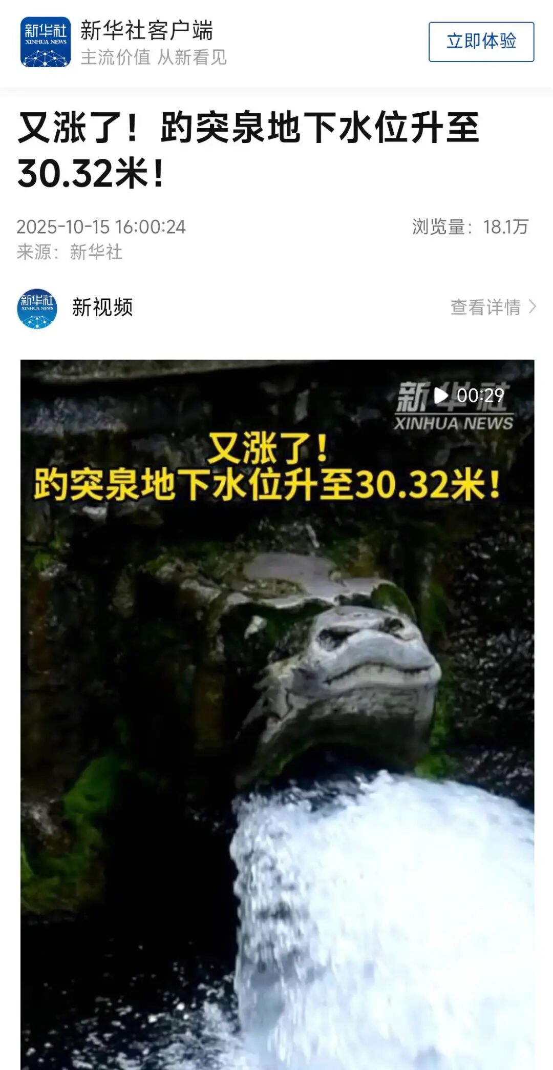 10月15日,新華社以《又漲了!趵突泉地下水位升至30.32米!》 為題,報(bào)道趵突泉實(shí)時(shí)水位達(dá)到30.32米,再次刷新1966年以來的最高水位紀(jì)錄。