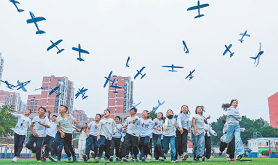 江蘇省宿遷市泗洪縣新星城西學(xué)校,學(xué)生們在放飛飛機(jī)模型。