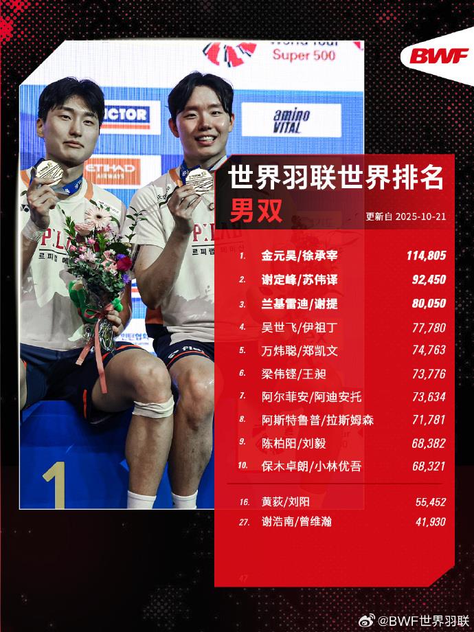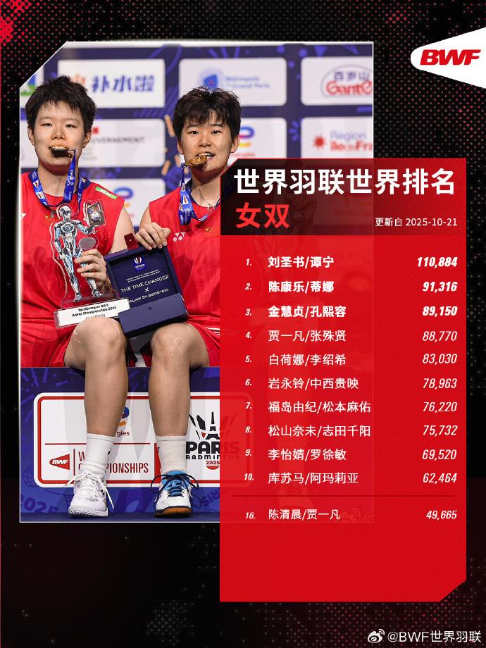 世界羽聯(lián)2025年第43周世界排名揭曉,中國隊強勢包攬三項世界第一:石宇奇(男單)、劉圣書/譚寧(女雙)、蔣振邦/魏雅欣(混雙)均以10萬+高分繼續(xù)領跑各單項第一。