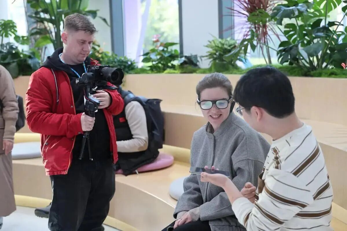 俄羅斯金磚國家電視臺高級記者Stoliarova Aleksandra佩戴AI翻譯眼鏡與亮亮視野的專家對話