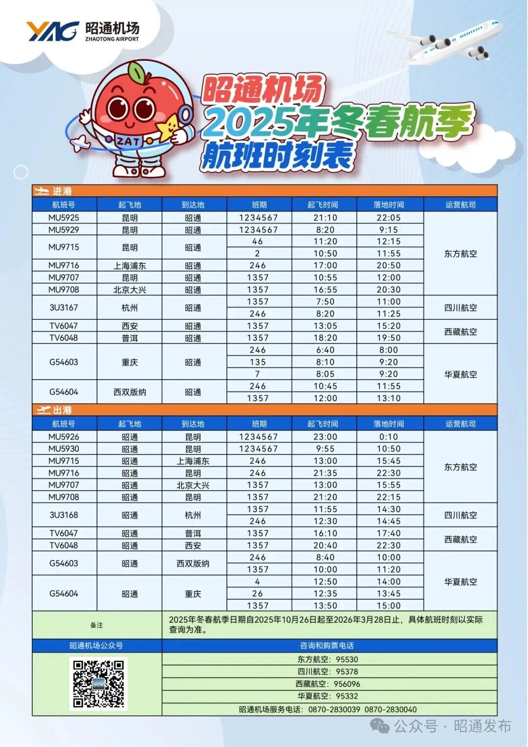 2025年冬春航季昭通機(jī)場(chǎng)計(jì)劃執(zhí)行,北京、上海、西安、杭州、重慶、昆明、西雙版納、普洱皆為直飛!