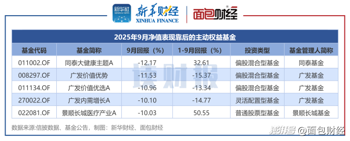 景順長(zhǎng)城基金、廣發(fā)基金、同泰基金等旗下5只主動(dòng)權(quán)益基金9月凈值下跌超過10%,表現(xiàn)相對(duì)落后。