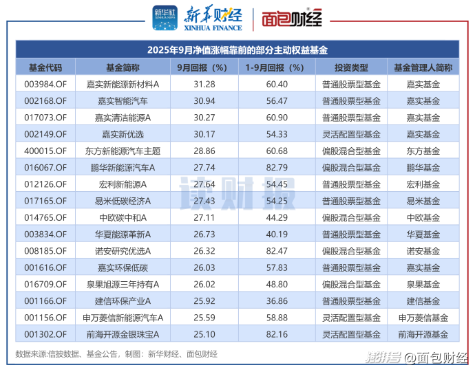 根據(jù)不完全統(tǒng)計(jì),2025年9月,共有70只主動(dòng)權(quán)益基金收益率超過20%,來自嘉實(shí)基金、東方基金、鵬華基金等機(jī)構(gòu)。其中,4只基金9月凈值上漲超過30%。