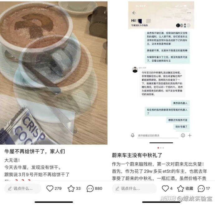 但蔚來(lái)的“降本”也并非空話,比如在今年9月,蔚來(lái)先后關(guān)閉了位于廣州的兩家牛屋。還有用戶在社交媒體上反映,蔚來(lái)牛屋取消了零食,中秋禮物也被取消了。
