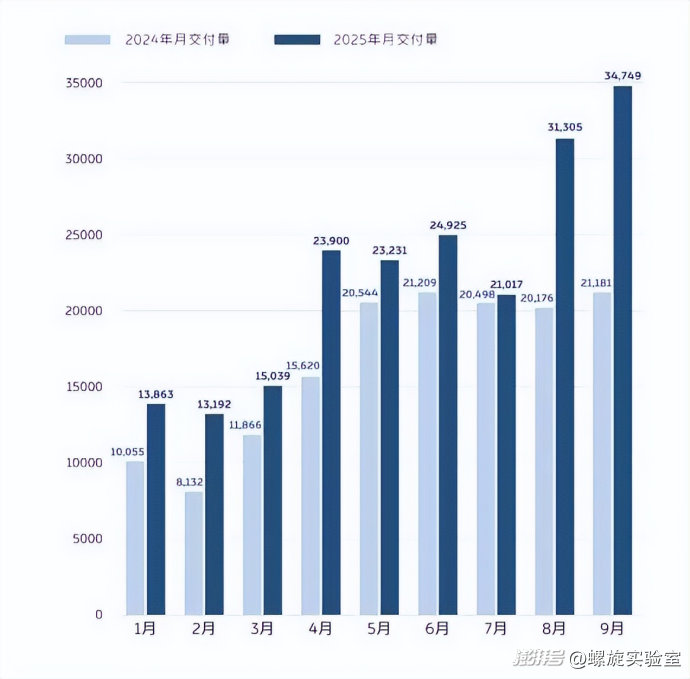 先看銷(xiāo)量。今年9月,蔚來(lái)交付新車(chē)34,749臺(tái),同比增長(zhǎng)64%。其中,蔚來(lái)品牌交付新車(chē)13,728臺(tái);樂(lè)道品牌交付新車(chē)15,246臺(tái);firefly螢火蟲(chóng)品牌交付新車(chē)5,775臺(tái)。第三季度,蔚來(lái)累計(jì)交付新車(chē)8.7萬(wàn)輛,刷新了季度交付紀(jì)錄。