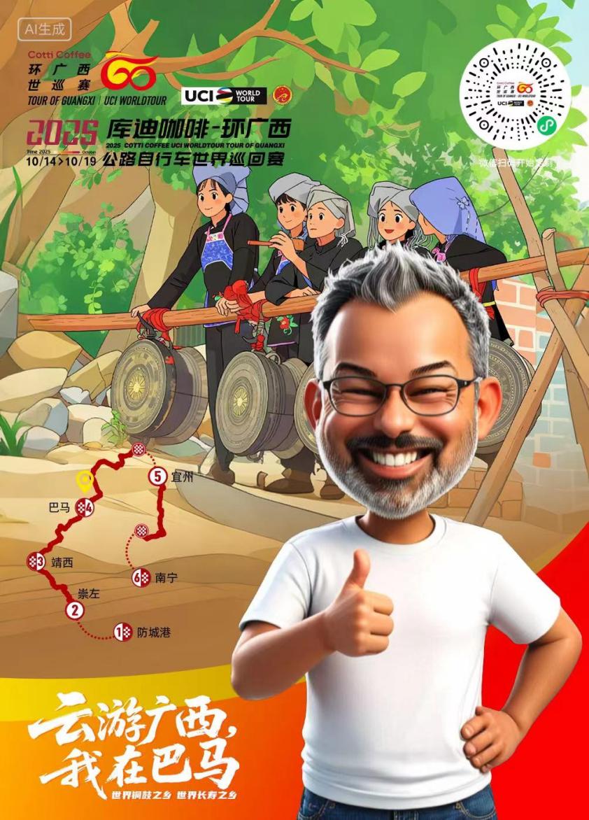 除了活躍現(xiàn)場氛圍的機(jī)器人之外,環(huán)廣西世巡賽還首次大規(guī)模應(yīng)用人工智能技術(shù),打造“云游廣西+沉浸互動”的雙重體驗。賽事組委會推出的“AI卡通形象定制工具”成為現(xiàn)象級互動產(chǎn)品——用戶上傳照片即可生成融合賽段城市風(fēng)格的專屬騎士形象,并衍生出徽章、冰箱貼等文創(chuàng)周邊,讓全球觀眾通過數(shù)字身份“參與”賽事。