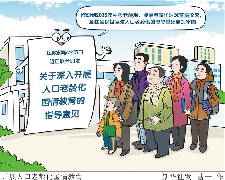 意見提出,將人口老齡化國情教育納入黨員、干部教育培訓(xùn)內(nèi)容,納入學(xué)校思想政治教育工作,納入老年大學(xué)(學(xué)校)、老年科技大學(xué)課程,納入社會(huì)主義核心價(jià)值觀宣傳教育,重點(diǎn)做好黨政干部、青少年、老年人、社會(huì)公眾等群體人口老齡化國情教育。