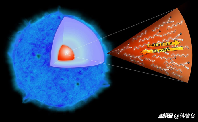 當(dāng)一顆恒星質(zhì)量非常大時(shí),它的核心會(huì)產(chǎn)生大量的伽馬射線,以至于部分輻射能量會(huì)轉(zhuǎn)化為粒子和反粒子對(duì)。由此產(chǎn)生的能量下降導(dǎo)致恒星在自身巨大引力的作用下坍縮。劇烈坍縮之后,失控的熱核反應(yīng)(圖中未顯示)隨之而來,恒星爆炸,將殘余物噴射到太空中。(圖片來源:維基百科)