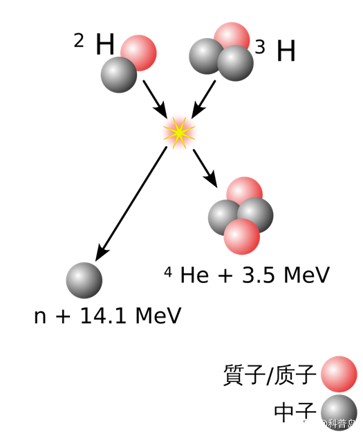 氘-氚 (D-T)的核聚變反應產生氦(He)與中子(n),期間釋放出的核能,在核聚變發(fā)電中具有較大的反應截面以及較低的粒子能量需求,是目前考慮中的未來主要能源。(圖片來源:維基百科)