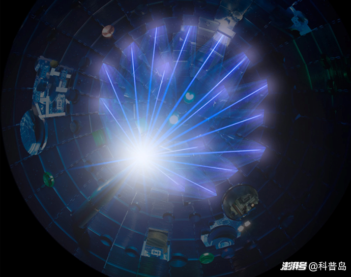 NIF 的 92束高能激光束會聚在靶室的中心,使微小的氫燃料顆粒內爆并引發(fā)熱核聚變反應。(圖片來源:勞倫斯利弗莫爾國家實驗室)