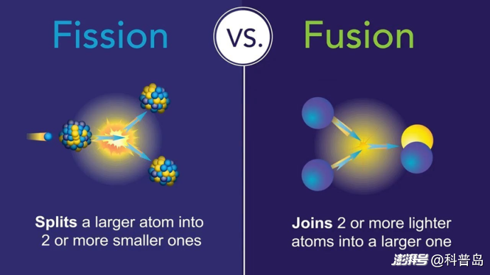 與我們熟知的核裂變(如核電站和原子彈使用的技術)不同,核聚變不是將重原子核分裂,而是將輕原子核融合。