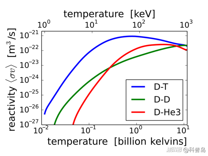 核聚變反應速率會一直與溫度一起上升,直到最大反應速率溫度后、逐漸下降。DT反應速度峰值的溫度是最低的(約70 keV或八億度k),而且高于另外的反應。(圖片來源:維基百科)