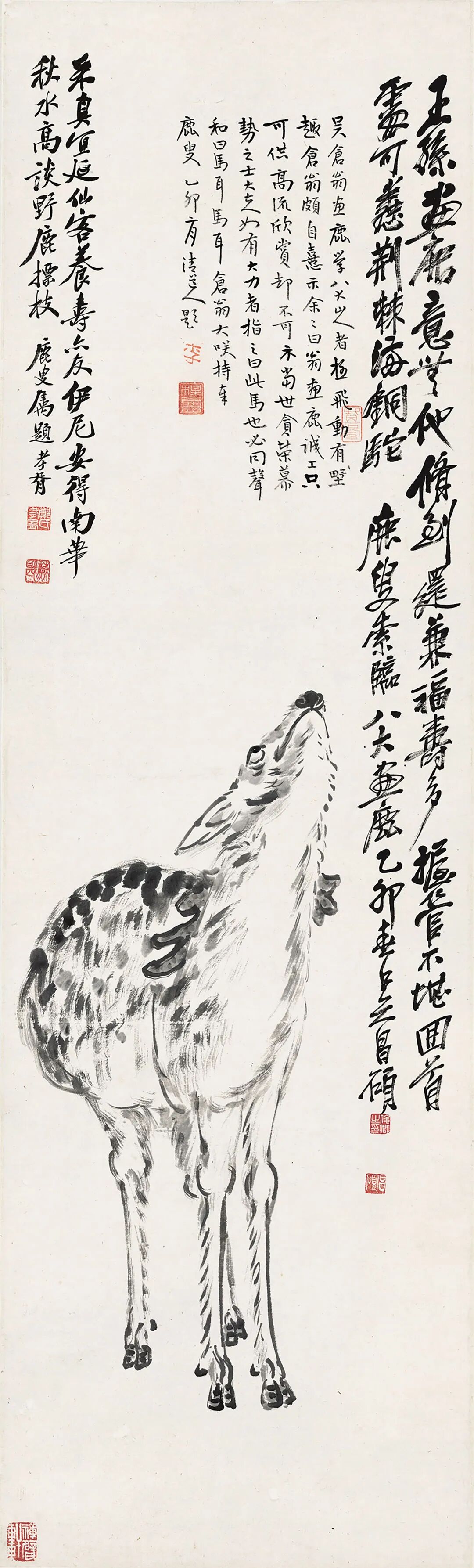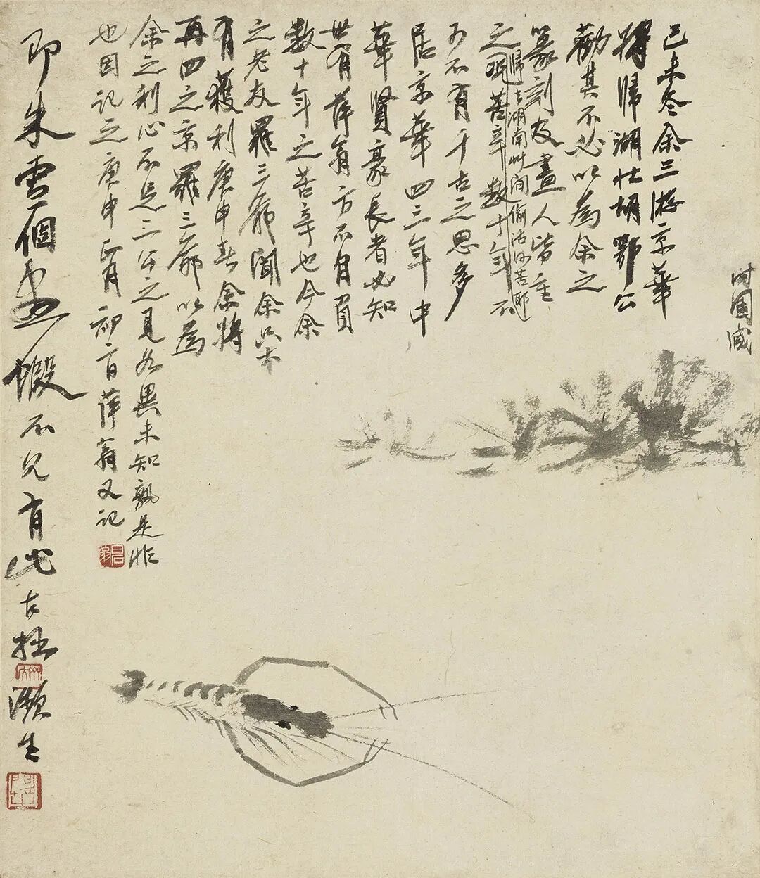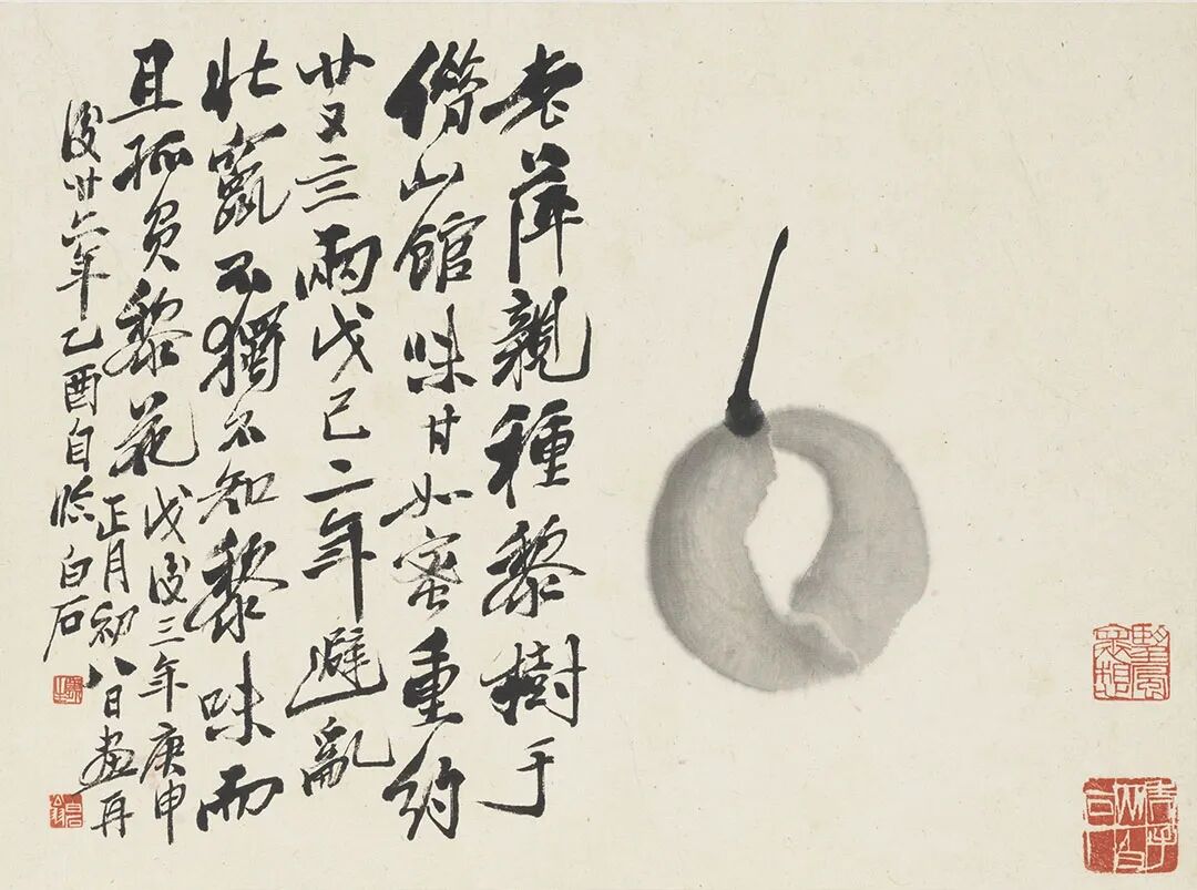 白石老人,學(xué)徐渭放逸而去其燥,學(xué)八大精簡(jiǎn)而舍其傲,取老缶金石之力而棄其繁,反復(fù)咀嚼三家,融會(huì)貫通之后,如哪吒脫胎換骨,晚歲重生,肉身不再,而詩(shī)心欲老,抓筆處,古人微妙,一生精修,亂世浮云,天人之慨,都從胸中到紙上,而為一代大家。