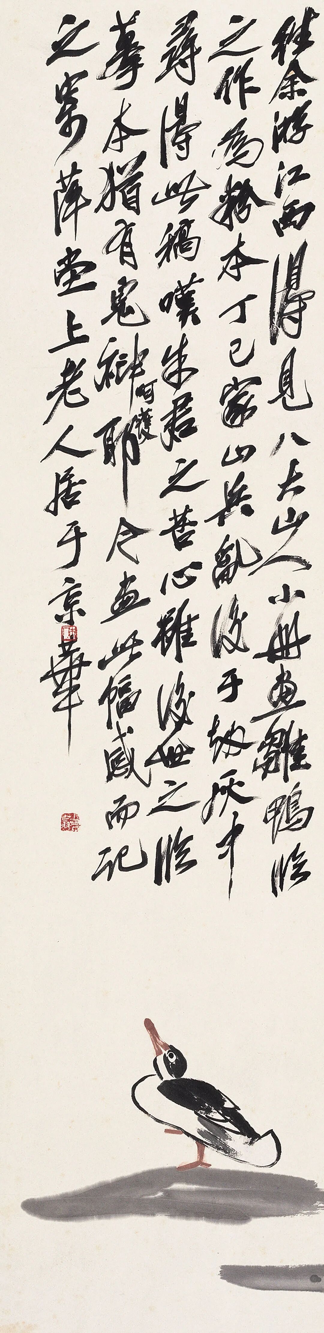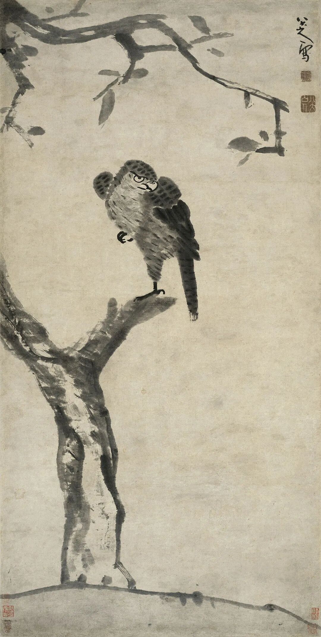 朱雪個(gè),明亡后,痛定苦修,從身外到心內(nèi)從肉體到靈魂重塑另造 ,而成八大山人,是面壁打坐而來(lái)的“極簡(jiǎn)主義”,其筆下,至簡(jiǎn)而至繁,如來(lái)一個(gè)微笑,而天花饑墜。他是避世修行的高手,后學(xué)當(dāng)師其心而非其技。