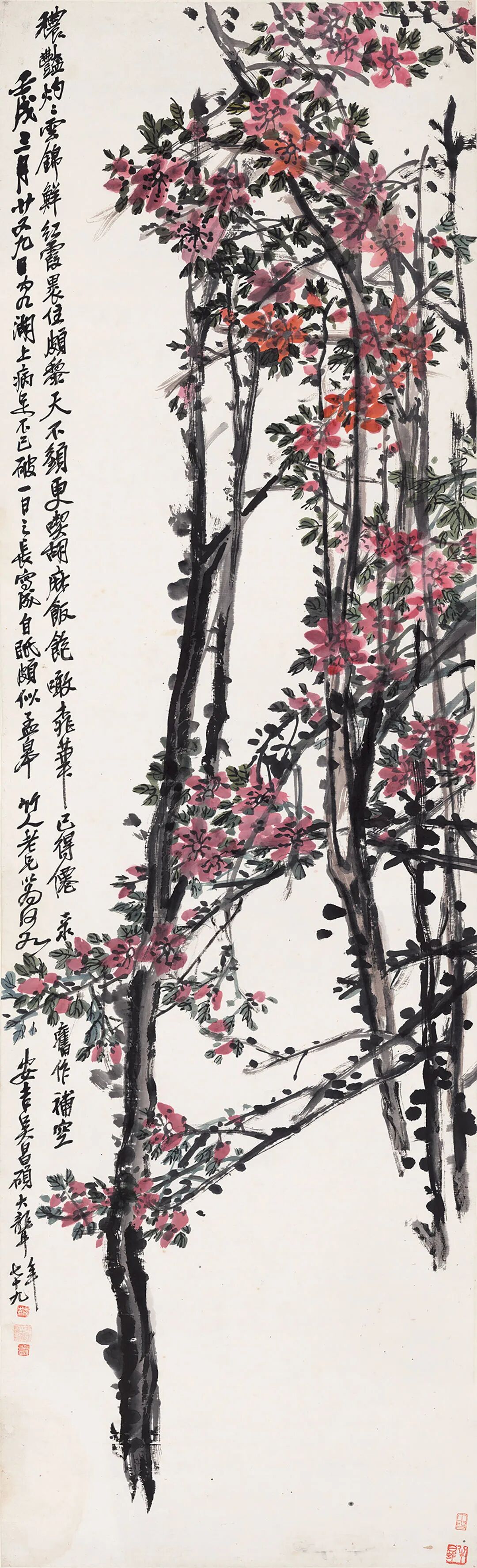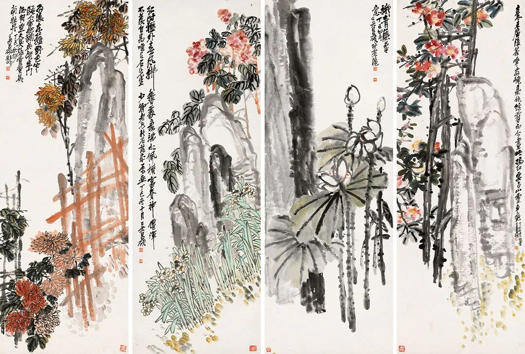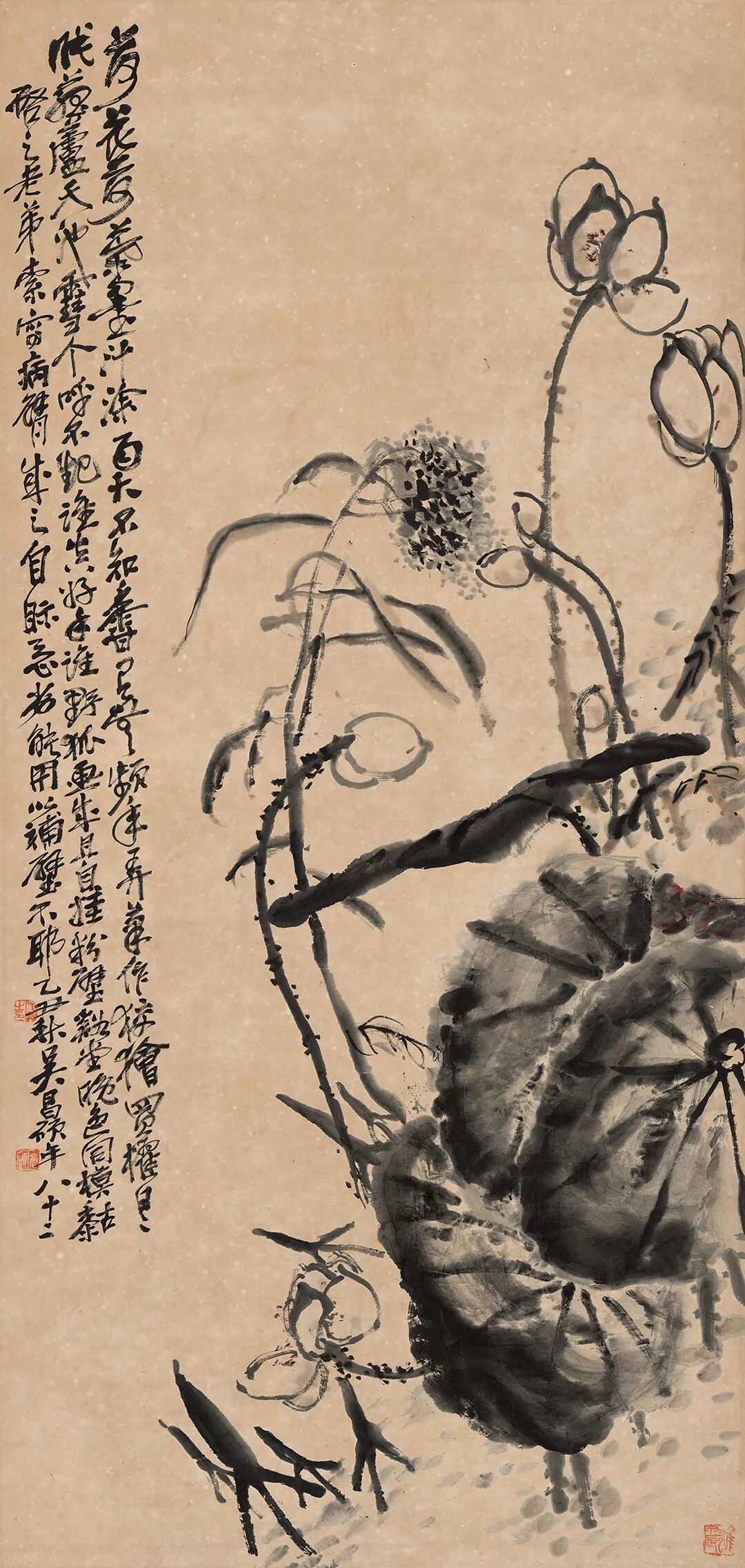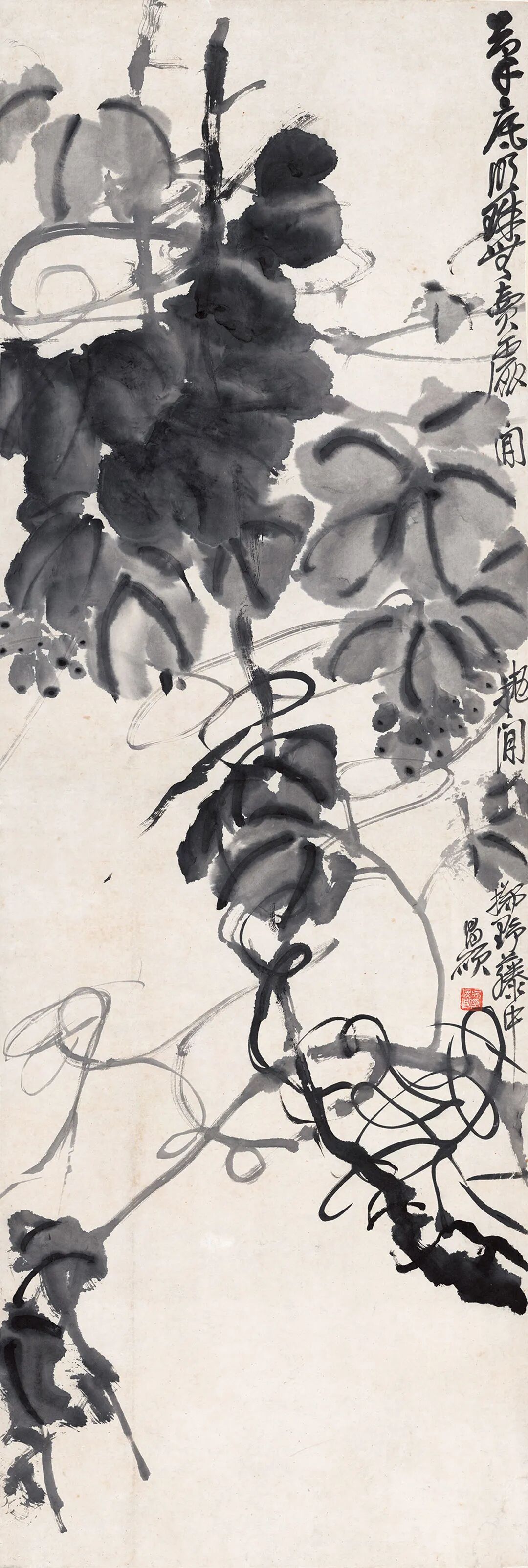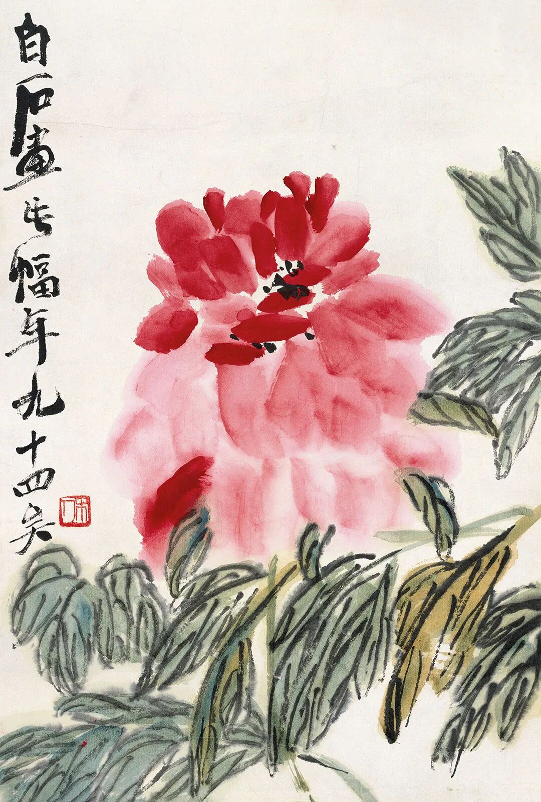 吳老缶,半世磨煉,三月去官,摸爬滾打局愈老彌堅(jiān)。他是俗世修行之典范。青藤、雪個(gè)各據(jù)天命之絕,寫意之“意”,似乎天成。而苦鐵老人盡了人事之力,筆力扛鼎,一個(gè)“寫”字,照亮生前身后,而終成一代宗師,開民國(guó)花鳥大寫意之高格。