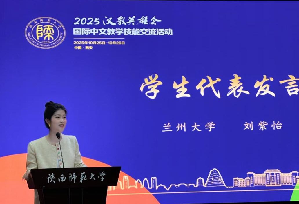 團(tuán)隊(duì)成員劉紫怡作為西北片區(qū)學(xué)生代表在開(kāi)幕式上作了發(fā)言。她說(shuō),國(guó)際中文教育傳遞的不僅是“你好”“謝謝”的語(yǔ)音語(yǔ)法,更是“和而不同”的哲學(xué)智慧與“天下大同”的博大情懷?!拔覀?cè)敢哉Z(yǔ)言為鑰匙,為世界打開(kāi)讀懂中國(guó)、感知中華文化的窗口?!奔鹊莱隽颂m州大學(xué)團(tuán)隊(duì)的初心使命,也呼應(yīng)了本次“教學(xué)聚能?智慧領(lǐng)航”的活動(dòng)主題。