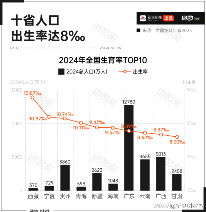 近日,國家統(tǒng)計(jì)局發(fā)布了《中國統(tǒng)計(jì)年鑒2025》,其中數(shù)據(jù)顯示,2024年共有10個(gè)省份的人口出生率達(dá)到或超過8‰。
