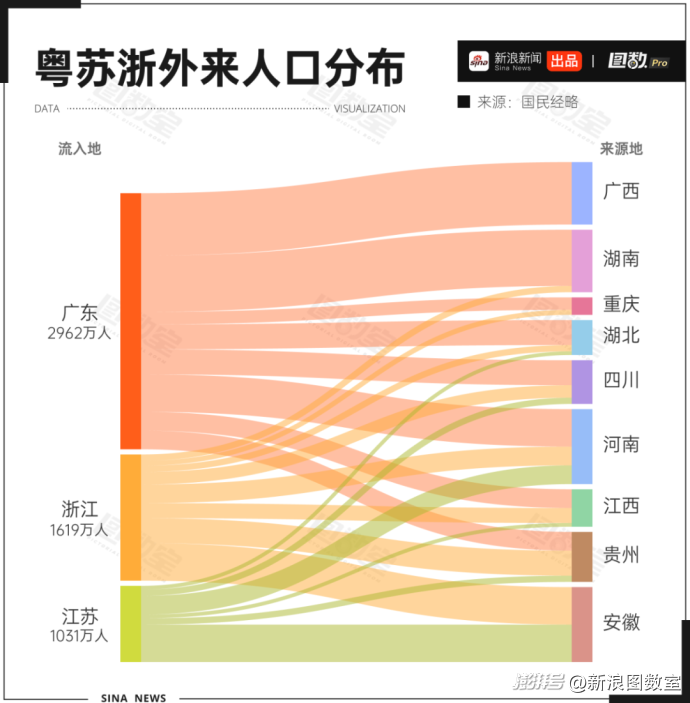 廣東外來人口不只數(shù)量眾多,并且來源分布廣泛。其中,來自廣西、湖南的雙雙超過500萬人,而河南、湖北、四川、江西、貴州均超過200萬人。