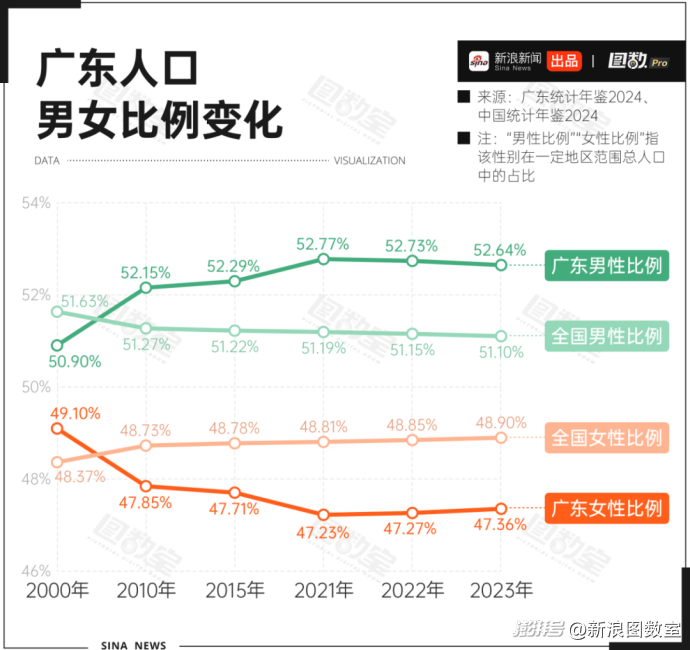 從近20年的數(shù)據(jù)來看,廣東男性比例始終“領(lǐng)跑”,從2000年50.9%漲到2023年的52.64%,和全國性別比逐漸靠攏的趨勢正好相反。