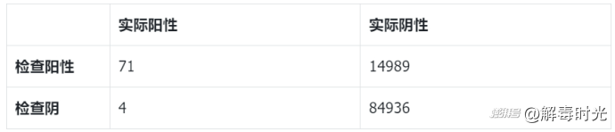 假設對10萬人進行檢測。按照實際的患病率,應該有75個病患和99925個正常人。全部的檢測中,由于命中率為95%,所以命中人數(shù)為75*95%約為71人,那么漏報就會有4人。