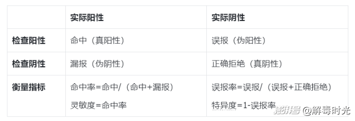 真實陽性被檢測出陽性稱為命中,也叫做真陽性;真實陽性被檢查出來陰性則稱為漏報,也叫做偽陰性。命中與命中和漏報的總和的比稱為命中率或靈敏度。真實陰性被檢查出陰性稱為正確拒絕,也叫做真陰性;真實陰性被檢查出陽性稱為誤報,也叫做偽陽性。誤報與誤報和正確拒絕之和的比例被稱為誤報率。