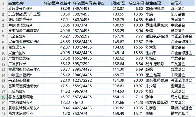 Wind數(shù)據(jù)顯示,市場上規(guī)模超百億元的普通股票型基金、混合型基金(不包含偏債混合型基金,只顯示初始基金)共有20只。除了睿遠成長價值A(chǔ)收益排在首位之外,排名第二的東方新能源汽車主題收益為60.5%,第三名銀河創(chuàng)新成長A收益為57.91%,第四名中歐時代先鋒A為53.05%。其他基金的收益均在50%以下。