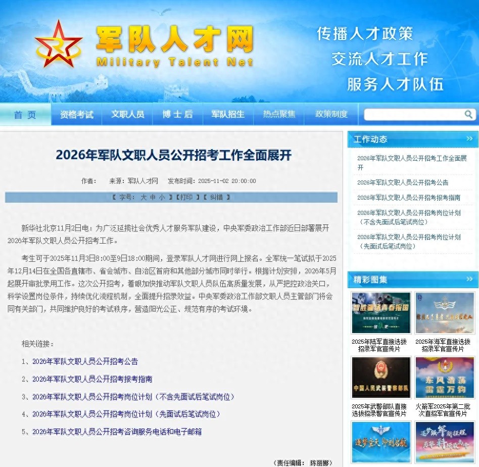 為廣泛延攬社會(huì)優(yōu)秀人才服務(wù)軍隊(duì)建設(shè),中央軍委政治工作部近日部署展開2026年軍隊(duì)文職人員公開招考工作。