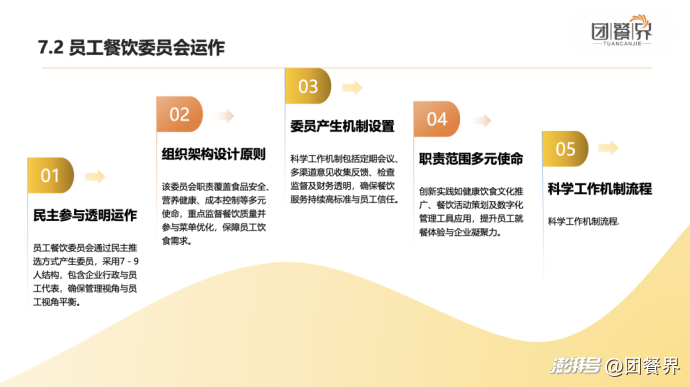 管理委員會由行政、人力資源、工會和員工代表組成,負(fù)責(zé)戰(zhàn)略制定和監(jiān)督;食堂運營團(tuán)隊則涵蓋主管、采購、廚房、服務(wù)和食品安全專員等崗位,確保各環(huán)節(jié)專業(yè)運作。