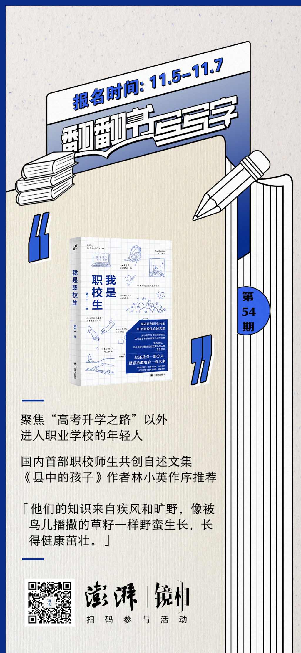 1、前往“湃客工坊”微信公眾號,在文章評論區(qū)告訴我們?yōu)槭裁聪胱x《我是職校生》,包括但不限于你對相關(guān)議題的了解及興趣。截止時間為11月7日12時。