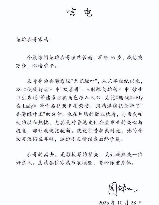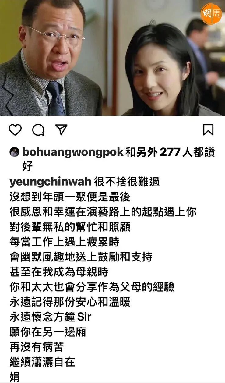 ▲ 許紹雄離世,她發(fā)出的悼念落款為“娟”,用了她在《新扎師妹》中角色方麗娟之名。懷有類似情感的后輩還有好幾位。許紹雄演過很多次父親、長輩,他也漸漸成了業(yè)內(nèi)前輩,但是他不擺譜,不需要?jiǎng)e人怕他,他總是在片場(chǎng)安慰年輕演員:演戲最重要是開心。