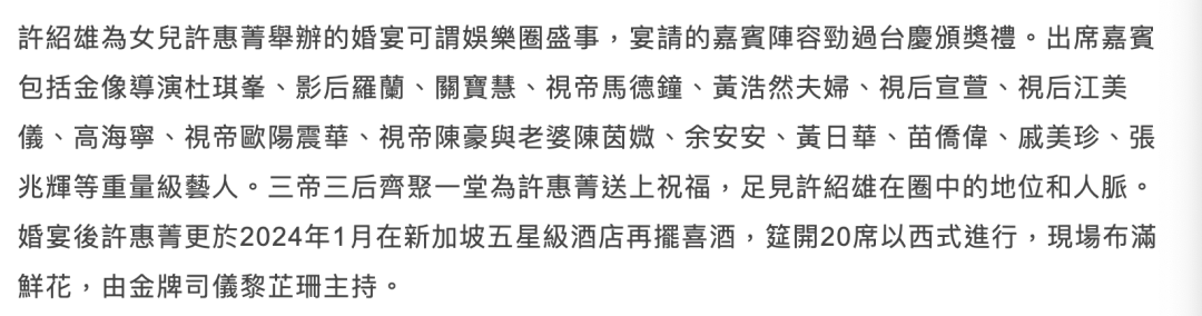 ▲ 許紹雄和黃子華。許紹雄過世,沒來得及趕到醫(yī)院告別的朋友,發(fā)文悼念者無數(shù)。他在漫長歲月里積累的那些或大或小的情誼,在那些特別的時(shí)刻突然涌現(xiàn),令不明內(nèi)情的路人驚嘆。這是最后一次,但其實(shí)不是第一次。比如2023年底許紹雄女兒結(jié)婚,半個(gè)TVB到賀,新聞報(bào)道是“婚宴勁過臺(tái)慶”,展示了他在圈內(nèi)的絕佳人緣。
