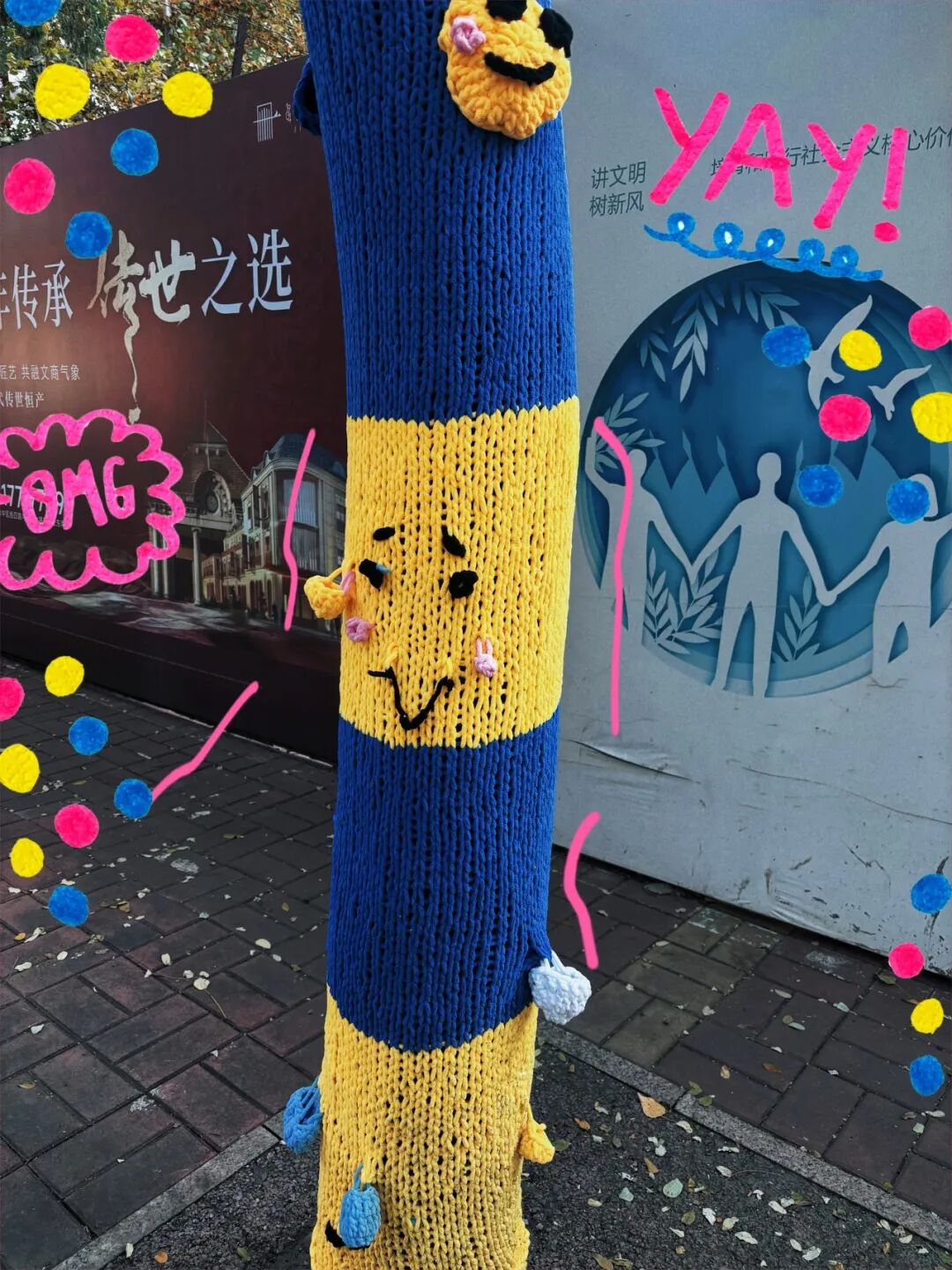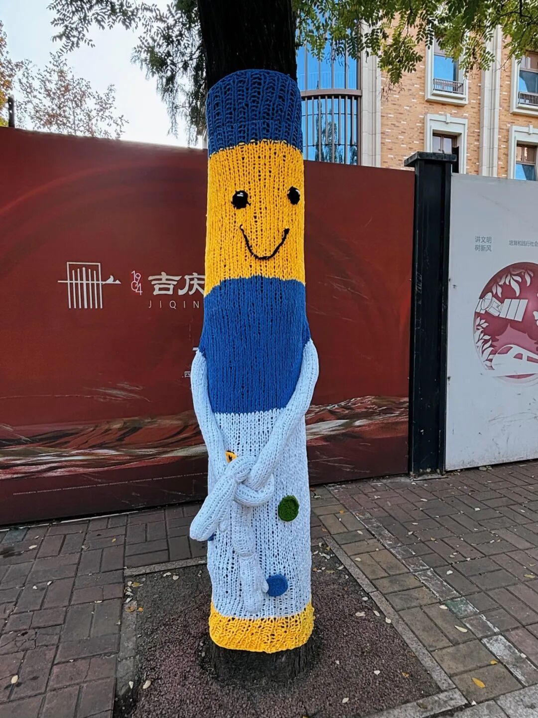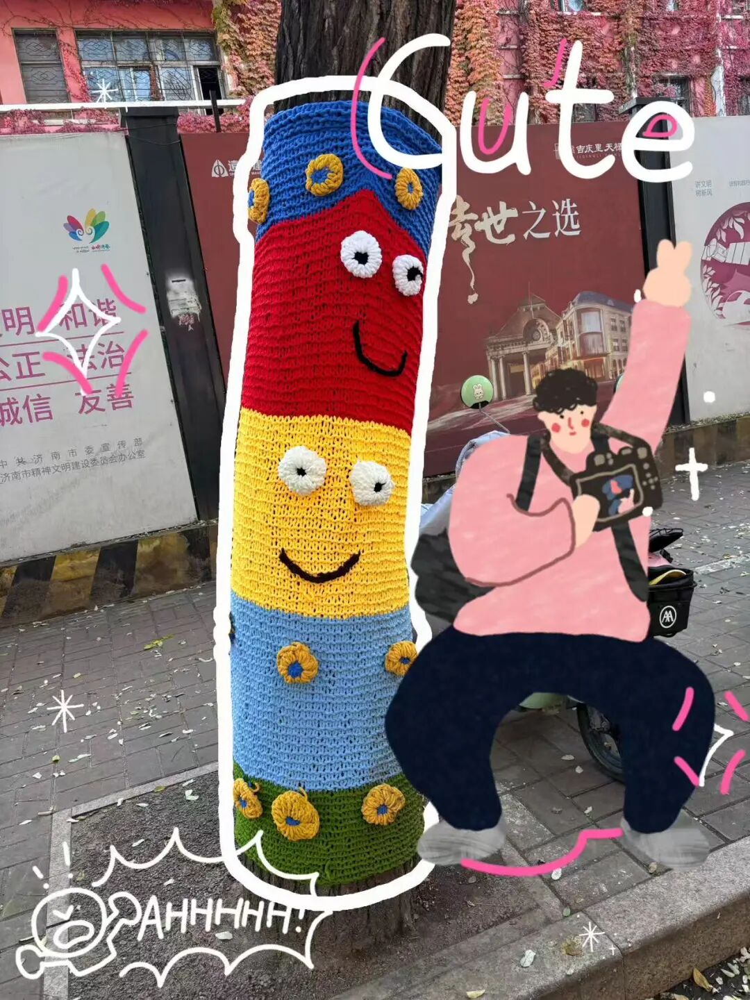 這些樹衣堪稱藝術(shù)品,條紋、波浪、菱形格等花紋豐富多樣,還自帶“表情包”——圓溜溜大眼睛滿是好奇,咧嘴微笑超治愈,俏皮造型像在熱情打招呼。