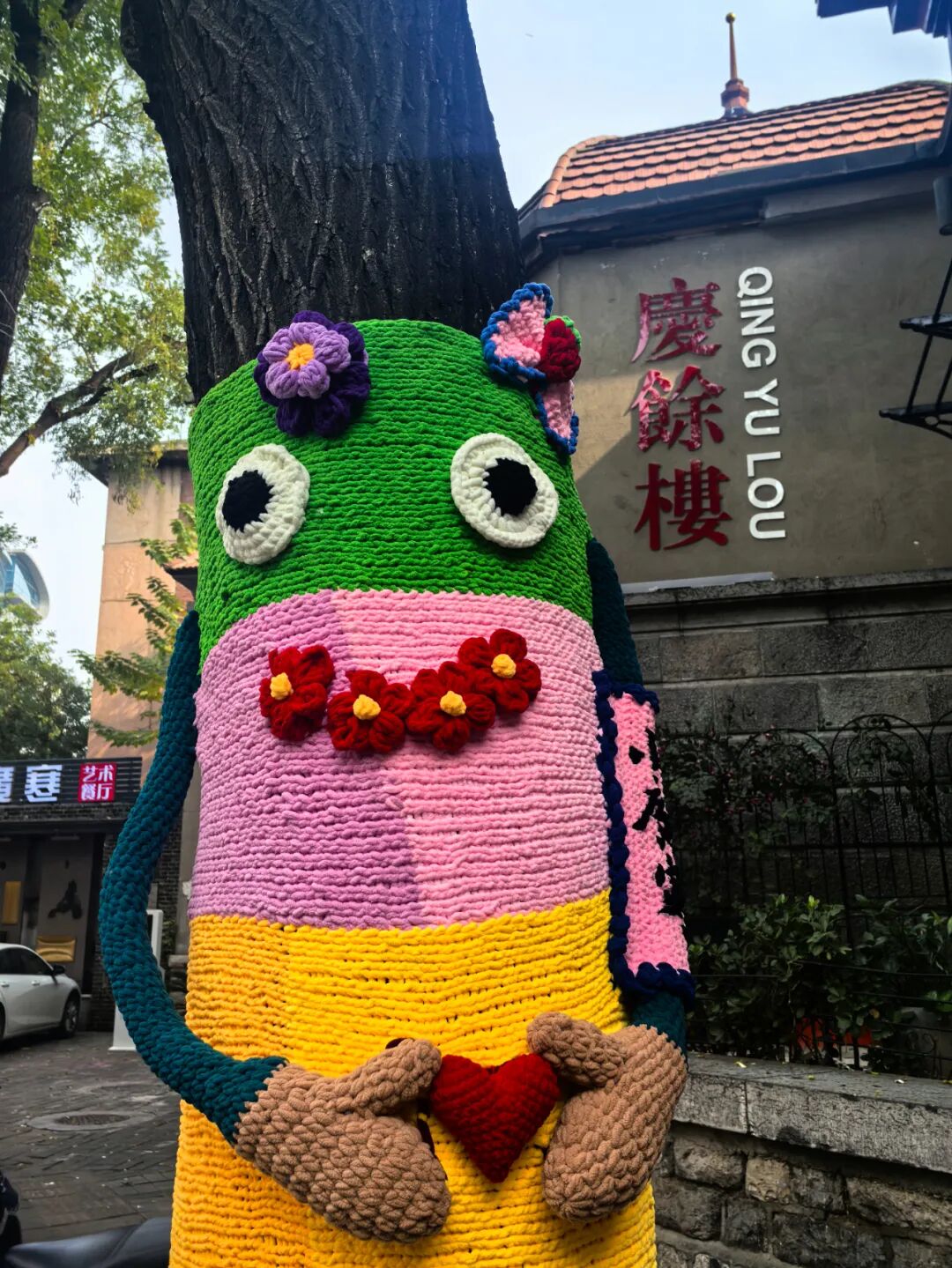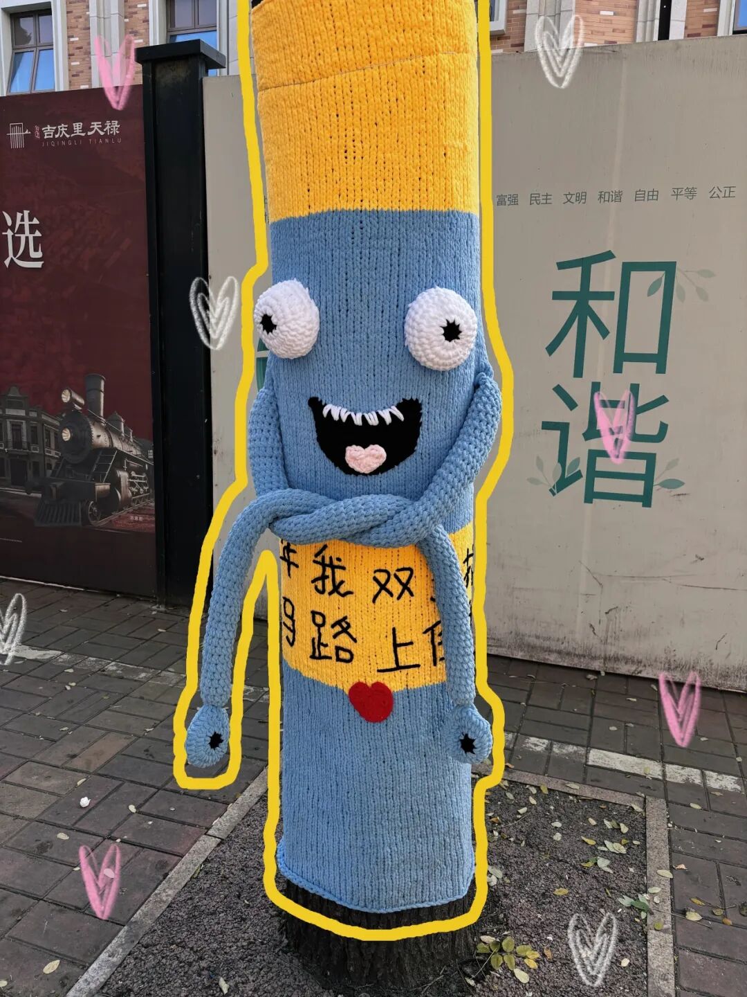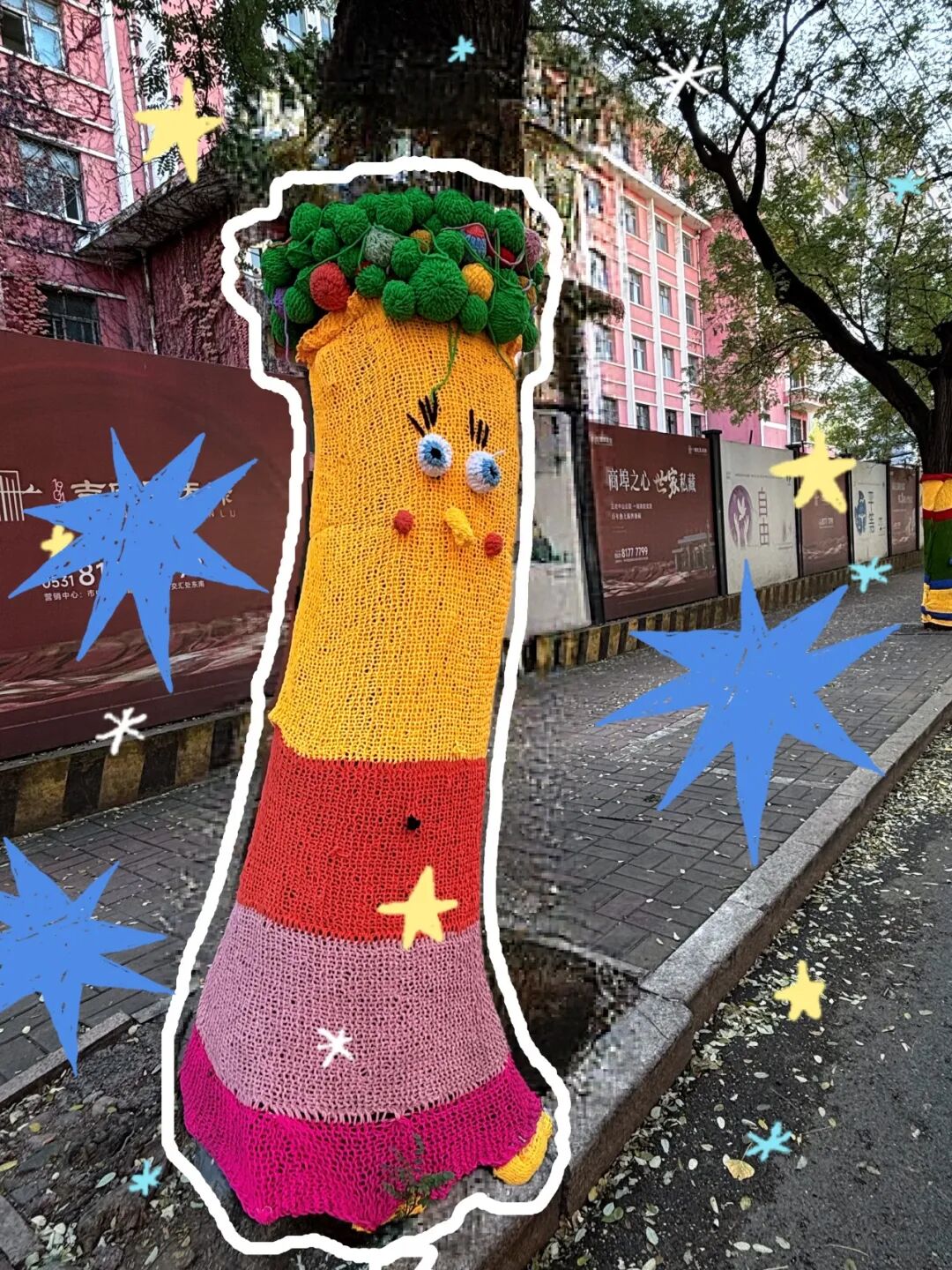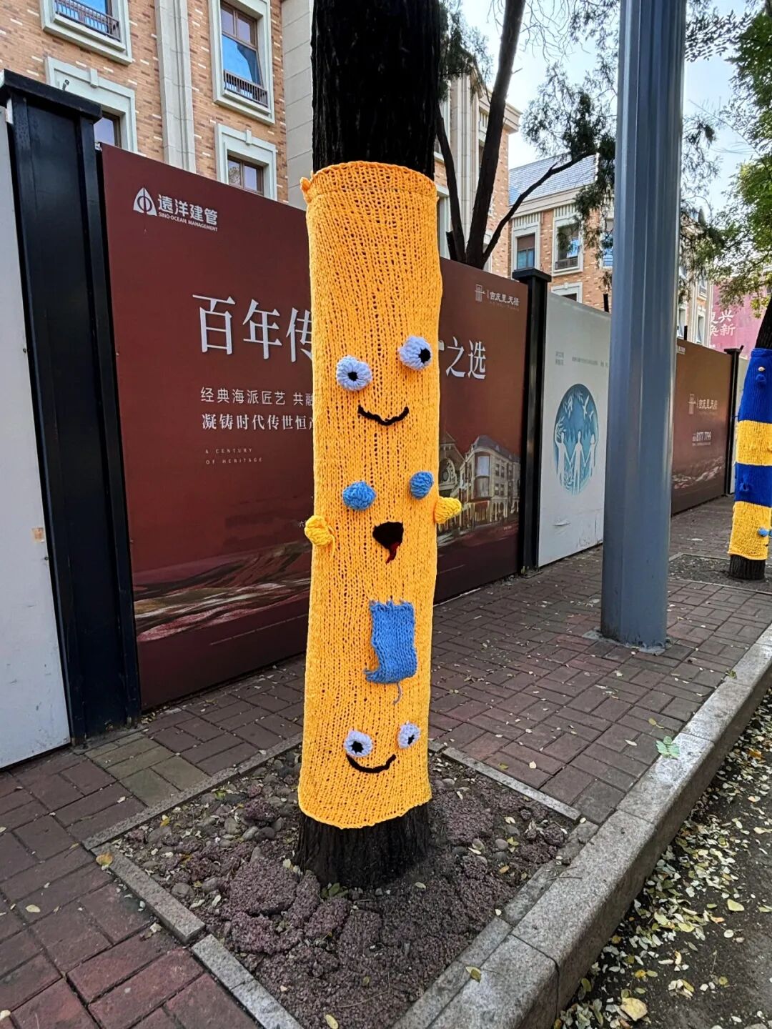 這些樹衣堪稱藝術(shù)品,條紋、波浪、菱形格等花紋豐富多樣,還自帶“表情包”——圓溜溜大眼睛滿是好奇,咧嘴微笑超治愈,俏皮造型像在熱情打招呼。