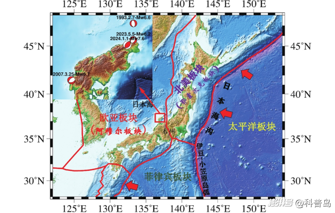 日本主要板塊構(gòu)造分布及能登半島1993—2024年間歷史強(qiáng)震分布(圖片來(lái)源:地震學(xué)報(bào))