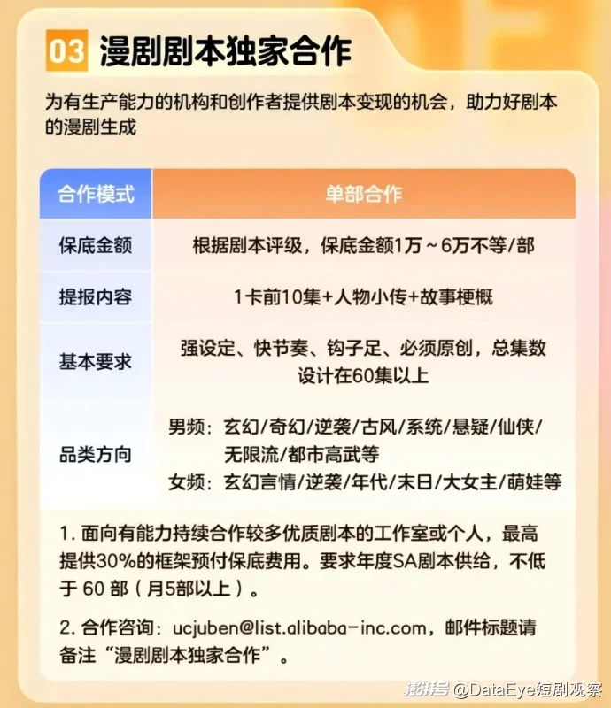 合作模式上采用單部合作模式,保底金額則根據(jù)劇本評級,每部1萬至6萬不等,提報內(nèi)容需包含“1卡前10集+人物小傳+故事梗概”,基本要求為強設定、快節(jié)奏、鉤子足,且必須原創(chuàng),總集數(shù)設計在60集以上。