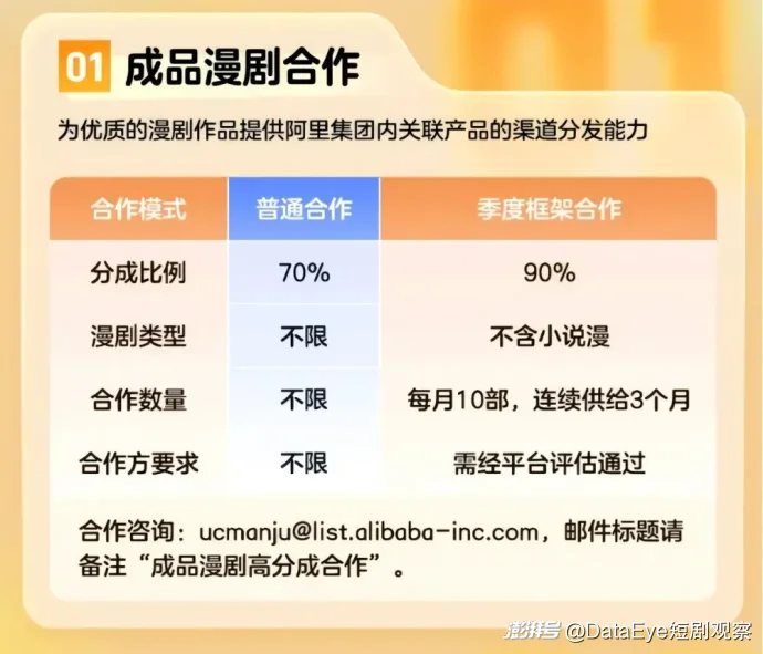 普通合作:分成比例70%,漫劇類型不限,合作數(shù)量不限、合作方要求不限;