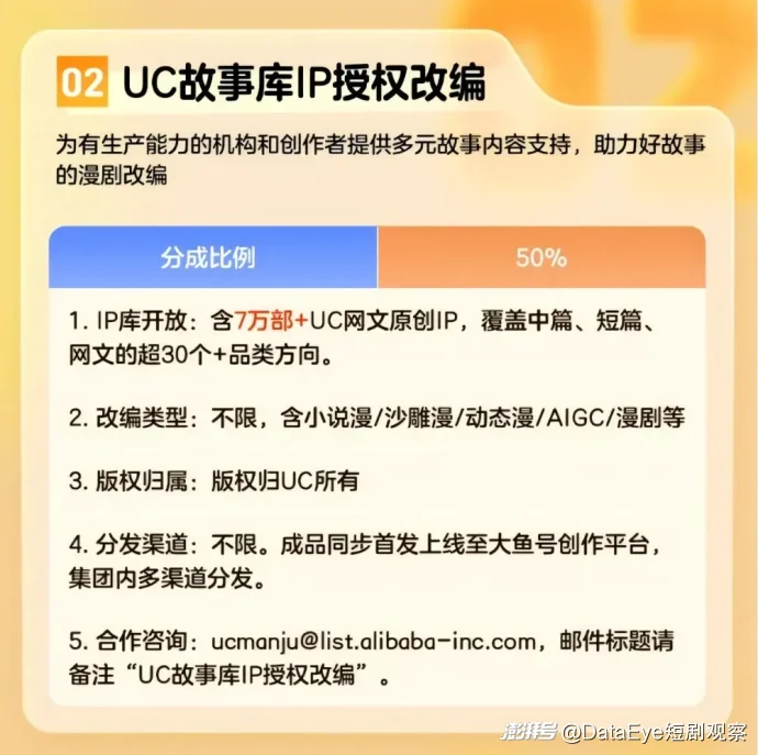 合作模式上,UC故事庫提供了超7萬部UC原創(chuàng)網(wǎng)文IP,覆蓋中篇、短篇、網(wǎng)文的超30個品類方向;改編類型不限,含小說漫、沙雕漫、動態(tài)漫、AIGC、漫劇等;分發(fā)渠道不限,成品同步首發(fā)上線至大魚號創(chuàng)作平臺,集團內(nèi)多渠道分發(fā);版權歸UC所有。