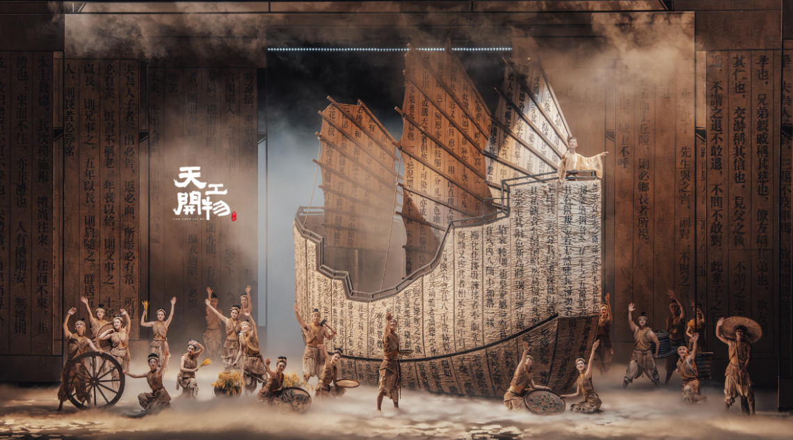 整個作品不僅體現(xiàn)了“留白”的東方美學,還兼具魔幻現(xiàn)實主義風格的視覺沖擊引導觀眾穿越時空,感受中華優(yōu)秀傳統(tǒng)文化中蘊含的永恒智慧與創(chuàng)新精神。該劇不僅是對《天工開物》文本的視覺解讀,更是一場關(guān)于傳承與創(chuàng)新、技術(shù)與人文的深刻舞臺實踐。