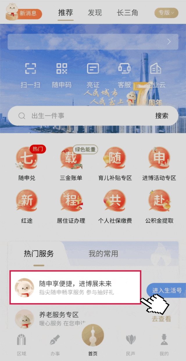 11月3日至10日,登錄“隨申辦市民云”APP,點擊首頁彈窗,或在熱門服務中找到“隨申享便捷 進博展未來”,進入活動專區(qū)。