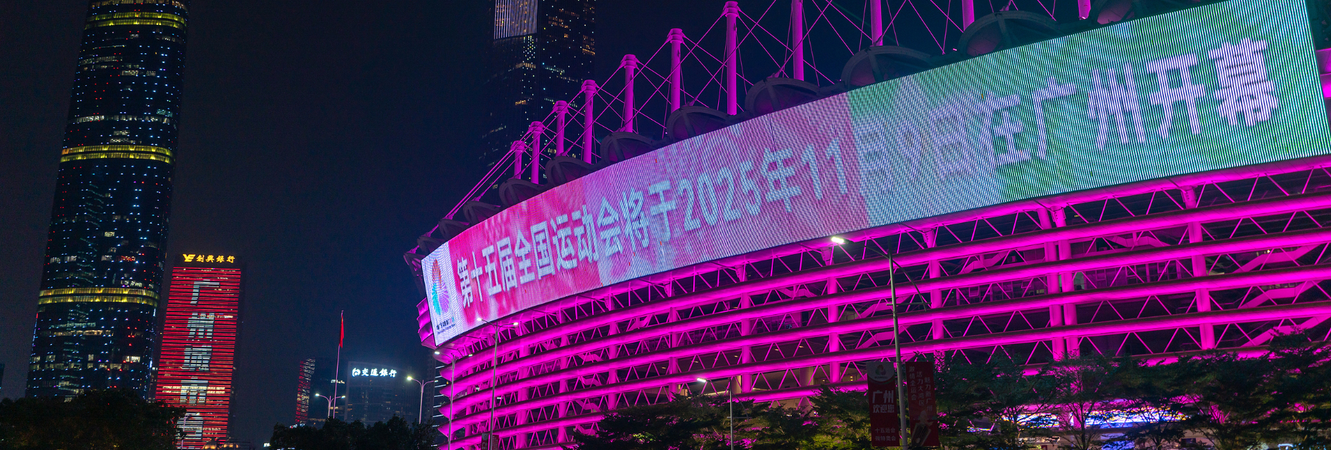 夜幕下的廣州海心沙亞運公園宣傳大屏正在宣傳第十五屆全運會開幕信息。視覺中國 圖