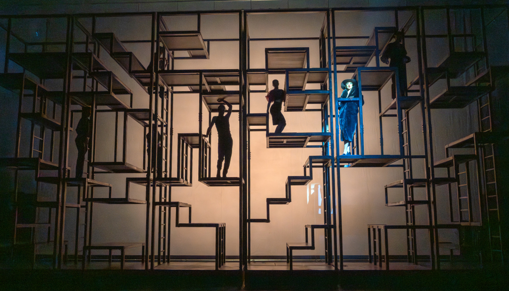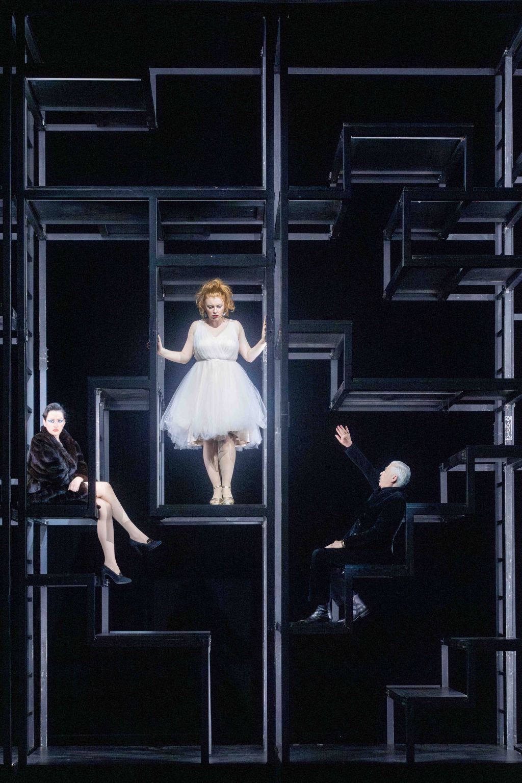 盡管它自上而下地將舞臺充滿,但這些黑色鋼架主宰的舞臺依舊是空舞臺。鋼架裸露,只有歌聲和臺詞的韻律在提醒我們空間的轉(zhuǎn)換。大開大合的燈光構(gòu)成場與場的切換,黑色鋼架的移動則僅在幕與幕的銜接處。在第一幕里,鋼架整齊并列,舞臺的景深被取消,成為一個絕對的平面。