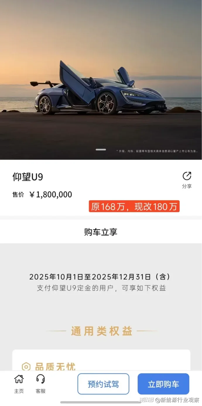 而仰望U9售價從168萬元上調(diào)至180萬元,這12萬元的漲幅也在社交媒體上引發(fā)熱議。雖然官方解釋新售價已包含此前需額外繳納的豪車稅及選裝的藍寶石按鍵,但消費者仍在質(zhì)疑:當(dāng)一款整備質(zhì)量兩噸多的“超跑”不斷調(diào)高價格,其產(chǎn)品定位是否已經(jīng)偏離了超跑的本質(zhì)?