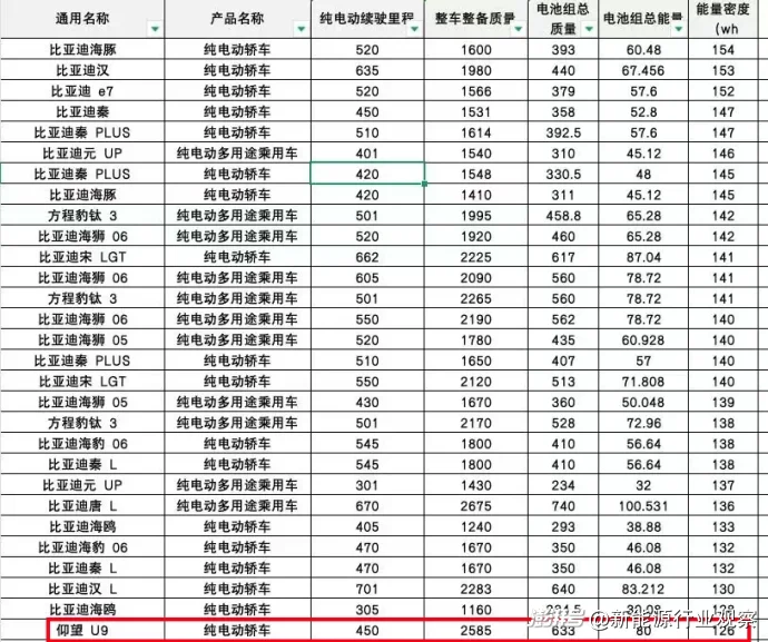 為什么它不能瘦身呢?我們來看一看它體重的大頭——動力電池。仰望U9采用的依然是磷酸鐵鋰的刀片電池,和比亞迪超過20款主力車型一樣,但在能量密度上,仰望U9的電池能量密度只有126Wh/kg,排名倒數(shù)第一,都比不過海鷗和海豚。