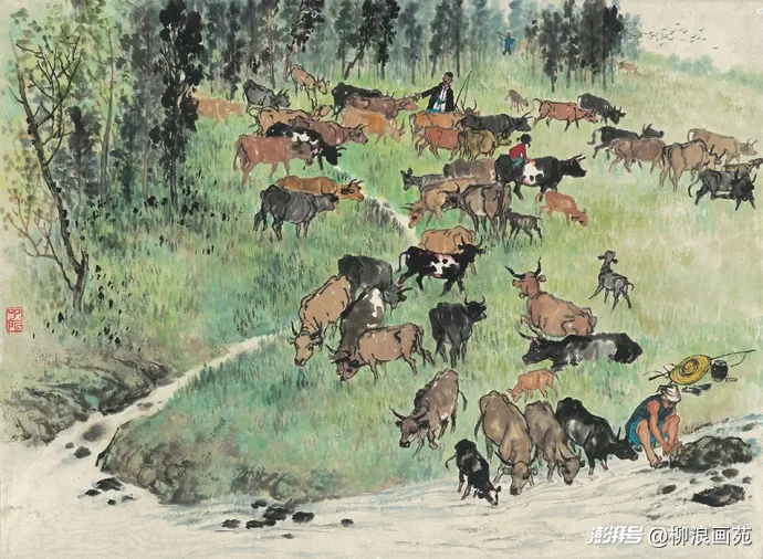 在二十世紀(jì)中葉的中國(guó)畫(huà)壇,主題性創(chuàng)作往往依賴于文學(xué)性敘事與情節(jié)描繪來(lái)傳達(dá)社會(huì)意識(shí)形態(tài)。呂云所的《漳河畔》組畫(huà)則展現(xiàn)了一種可貴的藝術(shù)自覺(jué)。它取材于完成社會(huì)主義改造后的太行山區(qū)農(nóng)村新貌,卻并未落入當(dāng)時(shí)流行的“情節(jié)化”創(chuàng)作窠臼。藝術(shù)家巧妙地將社會(huì)性主題內(nèi)化,轉(zhuǎn)而“偏重于以景寫(xiě)情的表現(xiàn)方法”,通過(guò)對(duì)漳河沿岸自然風(fēng)光與人文景觀的描繪,含蓄而真摯地抒發(fā)了對(duì)故鄉(xiāng)的深厚情感。這種“借景抒情”的創(chuàng)作傾向,不僅凸顯了呂云所作為藝術(shù)家的敏感與天賦,也在一定程度上疏離了直白的政治宣傳模式,使作品的藝術(shù)本體價(jià)值得以彰顯。