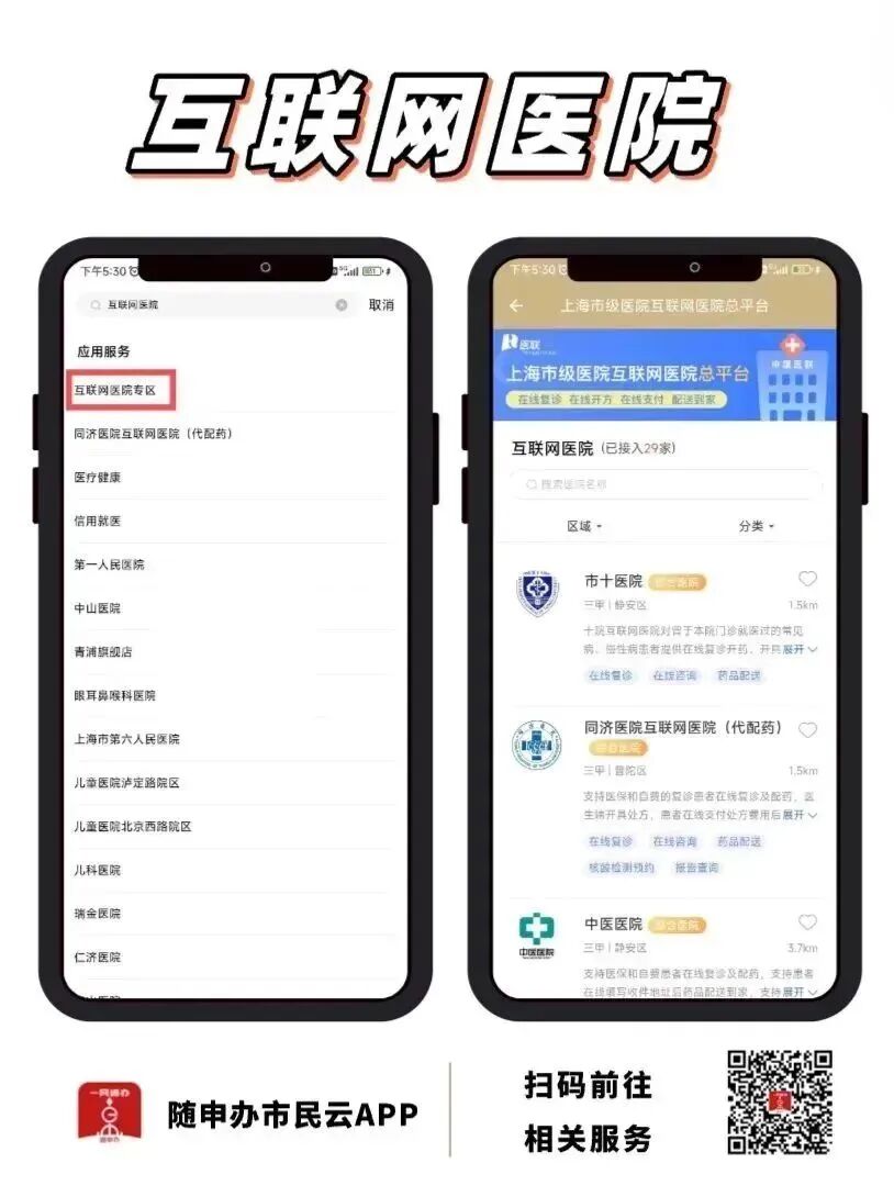 “隨申辦市民云”APP【互聯(lián)網(wǎng)醫(yī)院】專區(qū),足不出戶在線復(fù)診、藥品配送。